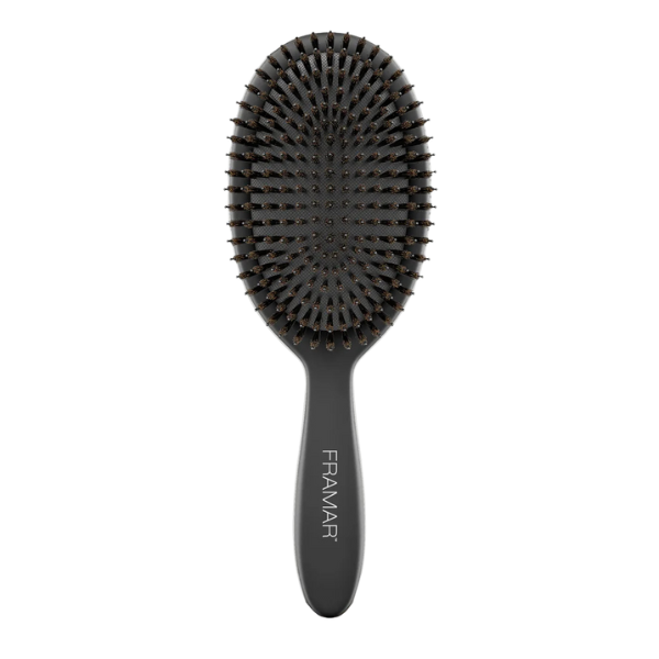 מברשת עיצוב מקצועית מבית FRAMAR עם זיפי חזיר אמיתיים וזיפים להתרת קשרים, אידיאלית לעיצובים חלקים וגלישים ובטוחה לשימוש בייבוש בפן.