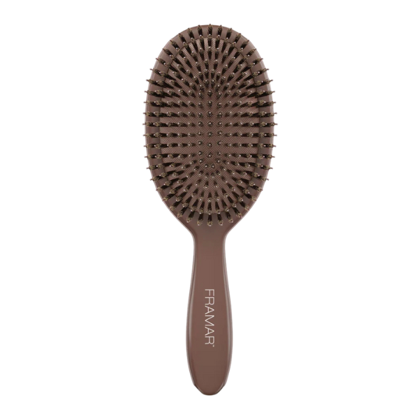 מברשת עיצוב מקצועית מבית FRAMAR עם זיפי חזיר אמיתיים וזיפים להתרת קשרים, אידיאלית לעיצובים חלקים וגלישים ובטוחה לשימוש בייבוש בפן.